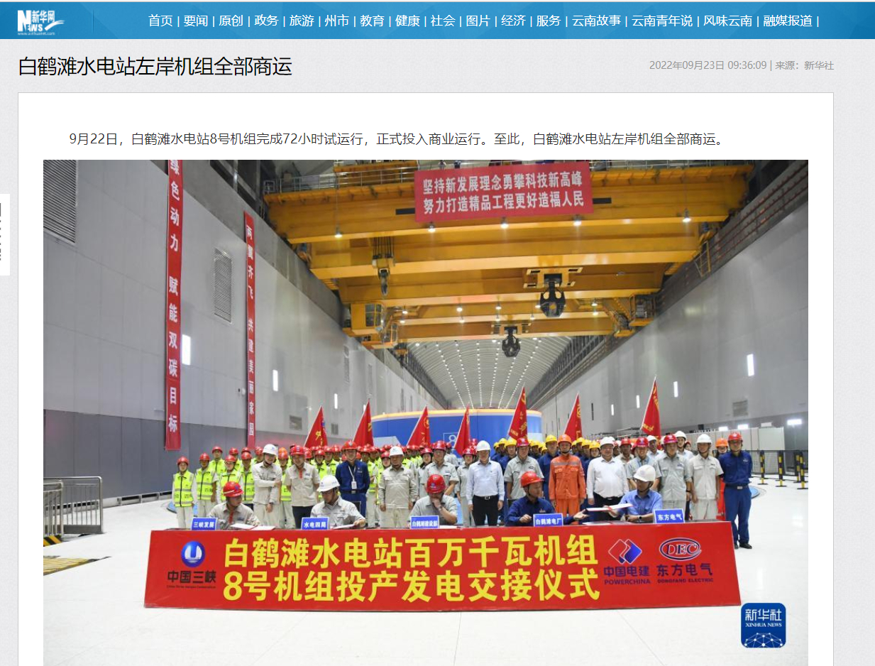 9月22日,白鹤滩水电站8号机组完成72小时试运行,正式投入商业运行。至此,白鹤滩水电站左岸机组全部商运。
