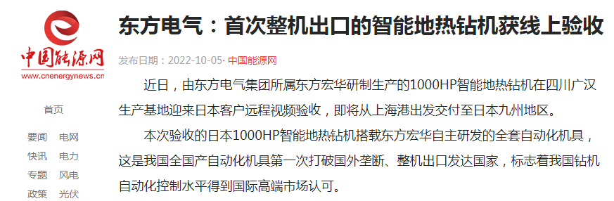 [中国能源网]东方电气:首次整机出口的智能地热钻机获线上验收