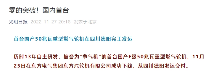 重型燃气轮机是发电和驱动领域的核心设备,体现了一个国家的重工业整体能力。今年5月国家能源局正式公告,东方电气集团研发的G50重型燃气轮机(50兆瓦)进入2021年度能源领域首台(套)重大技术装备项目名单。这台F级50兆瓦重型燃气轮机正式交付进入实际应用,标志着我国在重型燃气轮机领域实现了零的突破。