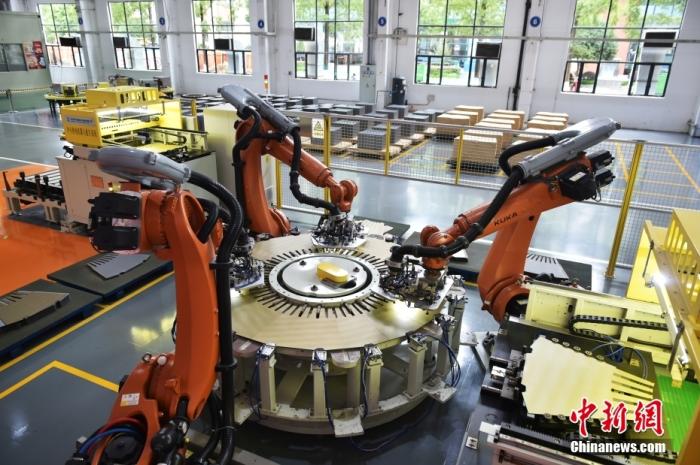 “无人车间”里的机器人在进行叠片作业。中新网记者 李骏 摄