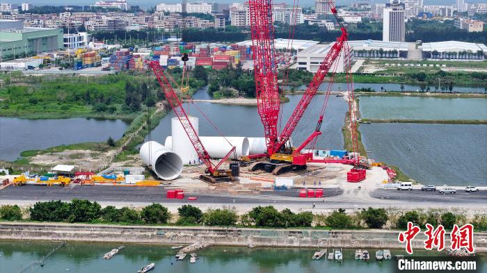 全球单机容量最大海上风电机组正在广东风电临海试验基地进行塔筒吊装。(广东电网公司 供图)