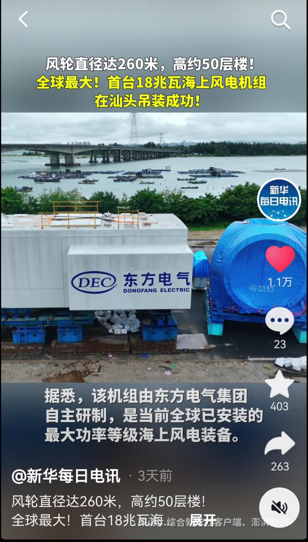 [新华每日电讯抖音]风轮直径达260米,高约50层楼!全球最大!首台18兆瓦海上风电机组在汕头吊装成功!