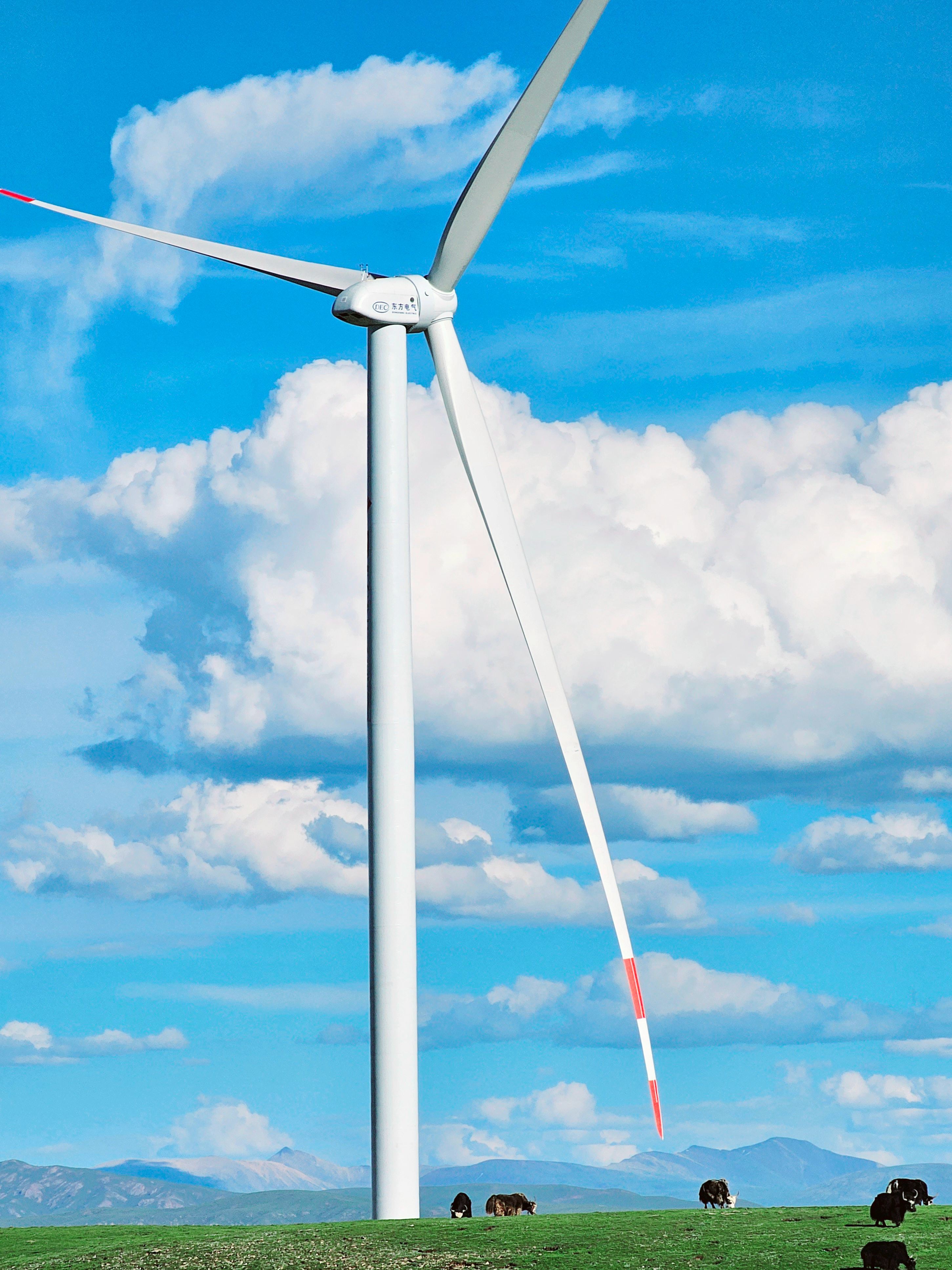 在世界屋脊,东方电气集团旗下东方风电研制的超高海拔风电机组,在全球4500米超高海拔大规模风电项目现场——那曲色尼区100兆瓦风电项目随风而动。
