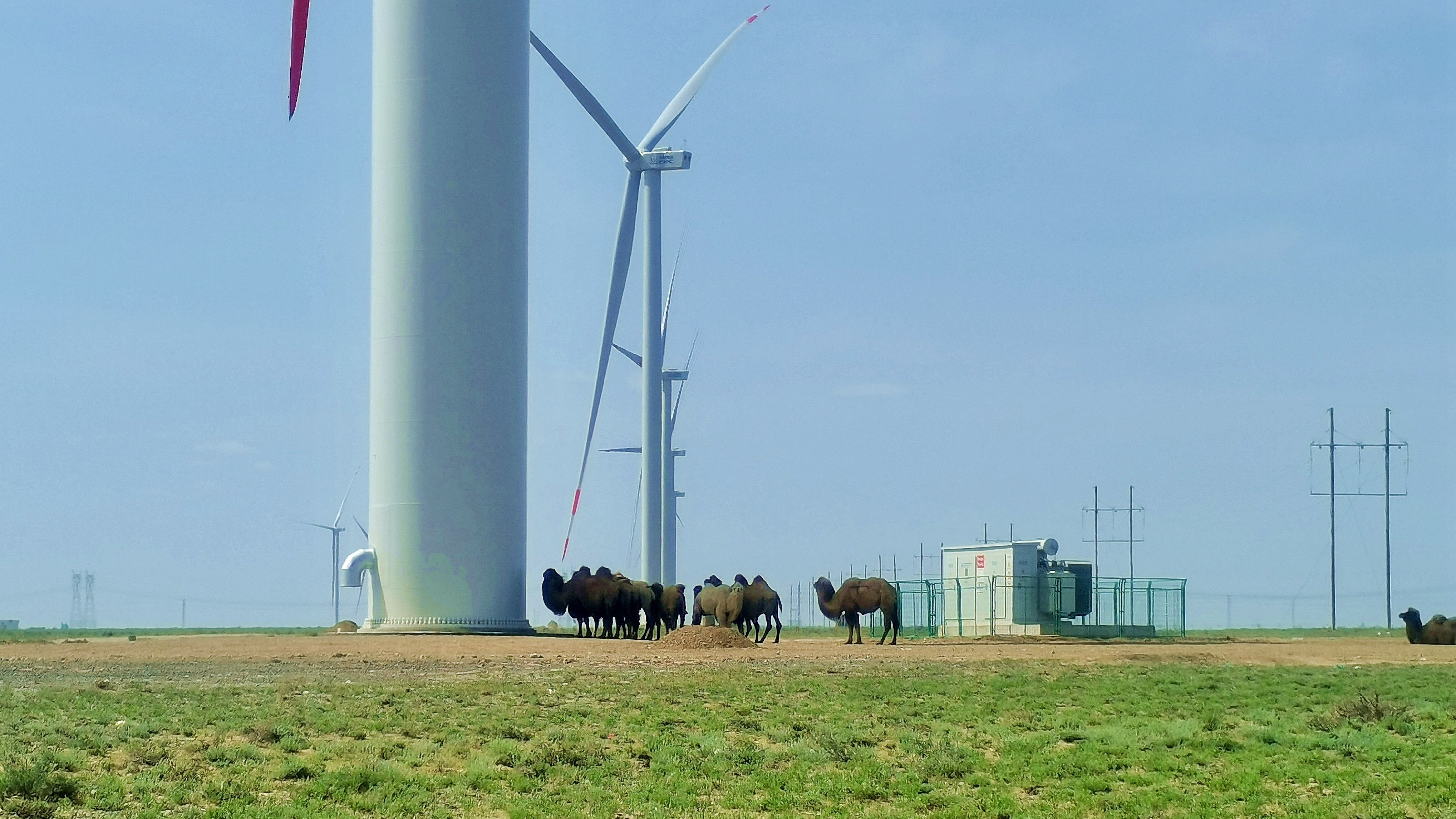 在大美新疆,东方风电为克拉玛依源网荷储一体化250兆瓦风电项目提供46台风电机组。成群的骆驼在东方风机下安心休憩。