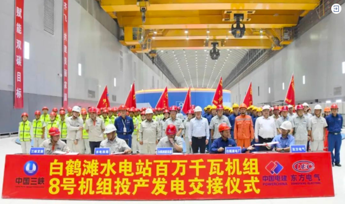 2022年9月22日,随着8号机组完成72小时试运行,金沙江白鹤滩水电站左岸全部8台机组投产。至此,东方电气白鹤滩项目研发制造、安装服务任务圆满收官。