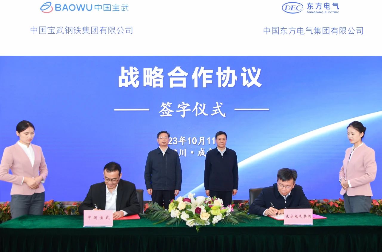 本网讯 10月11日,中国东方电气集团有限公司与中国宝武钢铁集团有限公司在蓉签署战略合作协议。在东方电气集团党组书记、董事长俞培根,中国宝武党委书记、董事长胡望明的共同见证下,东方电气集团党组成员、副总经理李忠军,中国宝武党委常委、宝钢股份党委书记、董事长邹继新代表双方签字。